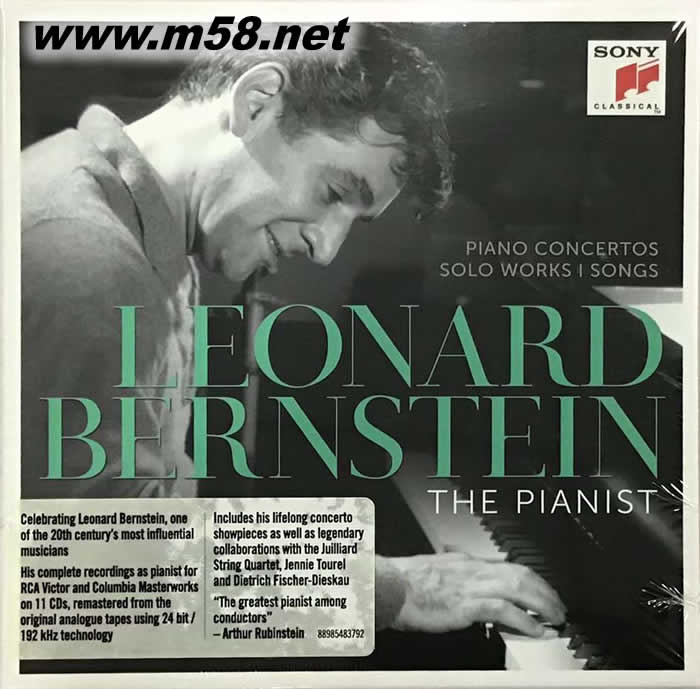 The Pianist Leonard Bernstein 11CD套裝(m58.net) 伯恩斯坦 Leonard Bernstein 伯恩斯坦百歲冥誕紀念專輯之一。 伯恩斯坦是指揮家中最偉大的鋼琴家,更是鋼琴家中最偉大的作曲家。 經常演出協奏曲時一邊指揮樂團一邊演奏鋼琴,或是為聲樂家以鋼琴伴奏。 在多重盛名影響下,往往掩蓋了他作為鋼琴演奏家的實際能力。 音樂大師伯恩斯坦(Leonard Bernstein)誕生于1918年,2018年為其100歲冥誕。為此,SONY唱片公司特別將旗下所擁有的伯恩斯坦鋼琴演奏之錄音,集合成這一套11CD的紀念專輯。 伯恩斯坦是集指揮家、作曲家、演奏家、教育家、理論家于一身的藝術大師,其藝術造詣舉世推崇,并堪稱是本世紀最偉大的指揮家、作曲家及鋼琴家。1918年8月25日出生于麻薩諸塞州的勞倫斯,而于1990年10月14日去世。其主要音樂教育完成于哈佛大學,1939年畢業后,又在寇蒂斯音樂院隨萊納學習作曲,1940年在壇格塢伯克夏音樂中心向庫塞維茨基(Sergey Koussevitzky)學習指揮。 自小接觸學琴,曾追隨多位老師學習。其中包含后來成為他秘書的Helen Coates。伯恩斯坦的鋼琴演奏才華在寇蒂斯音樂院發展成熟,指導老師便是知名的Isabelle Vengerova。 伯恩斯坦一直認為鋼琴是他的初戀,也經常演出協奏曲時一邊指揮樂團一邊演奏鋼琴,或是為聲樂家以鋼琴伴奏。早年伯恩斯坦在RCA Victor唱片公司錄制過拉威爾的《G大調鋼琴協奏曲》、亦師亦友的柯普蘭之《鋼琴奏鳴曲》,以及他為自己的連篇聲樂作品《我討厭音樂》(I Hate Music)擔任鋼琴伴奏,并又為次女高音Blanche Thebom演唱的錄音伴奏。他在Columbia唱片公司錄制的鋼琴協奏曲大多同時身兼演奏與指揮,錄音包括:拉威爾、莫扎特(K450、K453、K503)、貝多芬第一號、蕭士塔高維契第二號,以及蓋希文《藍色狂想曲》。 伯恩斯坦對于與茱莉亞弦樂四重奏一同演奏之莫扎特及舒曼室內樂作品錄音感到自豪。而對于他與次女高音Jennie Tourel多年友誼所合作的穆索斯基《死之歌與舞》、1969年3月2日卡內基音樂會,以及自己的作品之錄音,也相當滿意。 除了上述錄音,這套專輯也收錄了絕版許久,鋼琴伴奏版的馬勒《少年魔法號角》之錄音,由次女高音露德薇希(Christa Ludwig)與低男中音華特‧貝里(Walter Berry)聯袂獻唱。另外也收錄露德薇希演唱的布拉姆斯藝術歌曲,以及男中音費雪狄斯考所唱的馬勒作品。以上均由伯恩斯坦擔任鋼琴伴奏。 曾有人稱伯恩斯坦是「指揮家中最偉大的鋼琴家、作曲家中最偉大的指揮家,以及鋼琴家中最偉大的作曲家」。三句話便簡明扼要的將其一生成就定位。作為在音樂界舉足輕重的指揮家、作曲家、教育家,以及啟發無數人靈感的音樂導師,在這些盛名影響下,往往掩蓋了他作為鋼琴演奏家的實際能力。