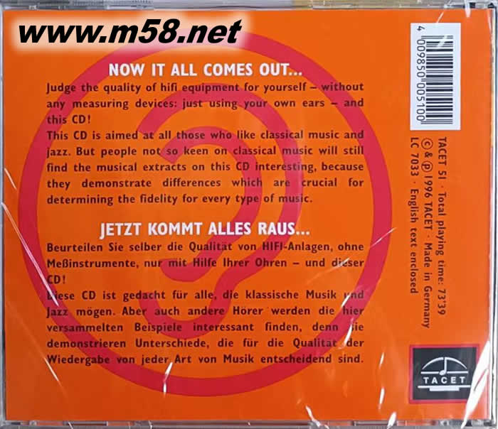 我的發燒寶典MY AUDIOPHILE COMPANION FOR CLASSICAL MUSIC AND JAZZ LOVERS(m58.net) 這是全世界第一張由德國錄音師親自設計、制作,可以適合各階層人士使用的音樂測試片。 全片內容分成兩大部分,第一部分是綜合測試,包括音響選購導引認識自己音響系統的實力、了解自己器材的聲音走向、甚至可以運用在多媒體計算機中。第二部分完全是針對音響迷設計的,包括教你認識模擬與數字的差異、考驗音響系統的再現能力、分辨各種A/D轉換器的不同,還有一些音響小秘方。這張唱片的內容原來是TACET老板的私房菜,他在判斷、調整錄音器材時經常用得到,如今,這份寶典也可以變成你的! 這張唱片是一張設計特殊的音響測試片,發燒友不需要透過儀器或訊號來檢是自己的音響系統,只需要透過Tacet安排好的美妙音樂,就可輕松地透過耳朵,知道自己的音響有什幺「衰聲」的疑難雜癥。片中七個測試重點包括有,左右聲道是否接反、相位問題、動態范圍、系統噪音、是否聽到失真、頻率響應等等,對任何一位音響迷來說,是兼具實用與欣賞的音響檢視CD。 整張唱片的設計,都環繞著Tacet的錄音哲學,Tacet認為一張好錄音必須有四個條件:麥克風接收正確的聲音、錄音技術不扭曲原音、演奏呼吸不應被剪輯打斷、杰出的音樂家風格。 第一部分 重點Ⅰ 左右聲道相反了嗎? 重點Ⅱ 你聽到的聲音+/-相位確嗎? 重點Ⅲ 你聽到的聲音動態受到壓抑嗎? 重點Ⅳ 你的音響系統有雜音嗎? 重點Ⅴ 兩支喇叭的音量一樣嗎? 重點Ⅵ 你聽得到任何失真嗎? 重點Ⅶ 頻率響應測試,你的音響有染色嗎? CD唱盤讀取速度測試 第二部分 :有關錄音、混音過程時各種數據、項目不同變化