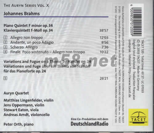 此專輯中Auryn以典雅柔和的風(fēng)格詮釋『布拉姆斯』的作品,團(tuán)員間密不透風(fēng)的絕佳默契,讓您可以感受到濃烈交融的包圍質(zhì)感。合作的美國著名「史坦威」鋼琴演奏家--『彼德‧歐爾斯』,于茱麗亞音樂學(xué)院跟隨傳奇名師Adele Marcus習(xí)琴,隨后受到魯?shù)婪?#8231;賽爾金的賞識改投其下。如珠玉般透明圓潤的琴音表現(xiàn),優(yōu)雅但不喧賓奪主,巧妙地將室內(nèi)樂中的各個(gè)小節(jié)線串聯(lián)起來,造成一種牽動(dòng)的感覺,緊扣著每位聆聽者的心弦,讓人久久無法自己。
