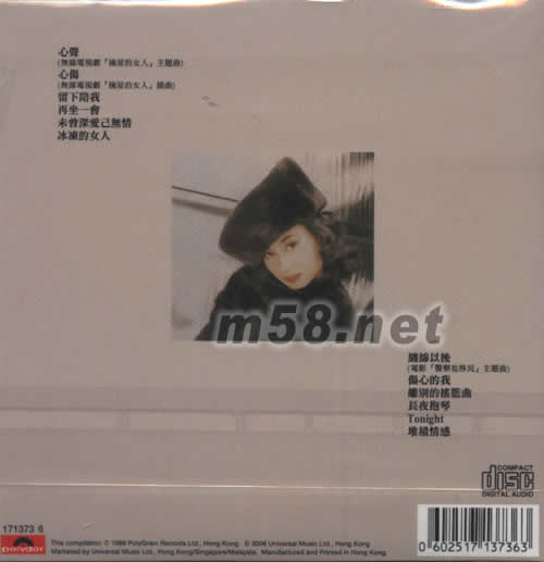 01. 心聲 無線電視據[摘星的女人]主題曲 02. 心傷 無線電視據[摘星的女人]插曲 03. 留下陪我 04. 再坐一會 05. 未曾深愛已無情 06. 冰凍的女人 07. 纏綿以后 電影[警察也移民]主題曲 08. 傷心的我 09. 離別的搖籃曲 10. 長夜抱琴 11. Tonight 12. 堆積情感