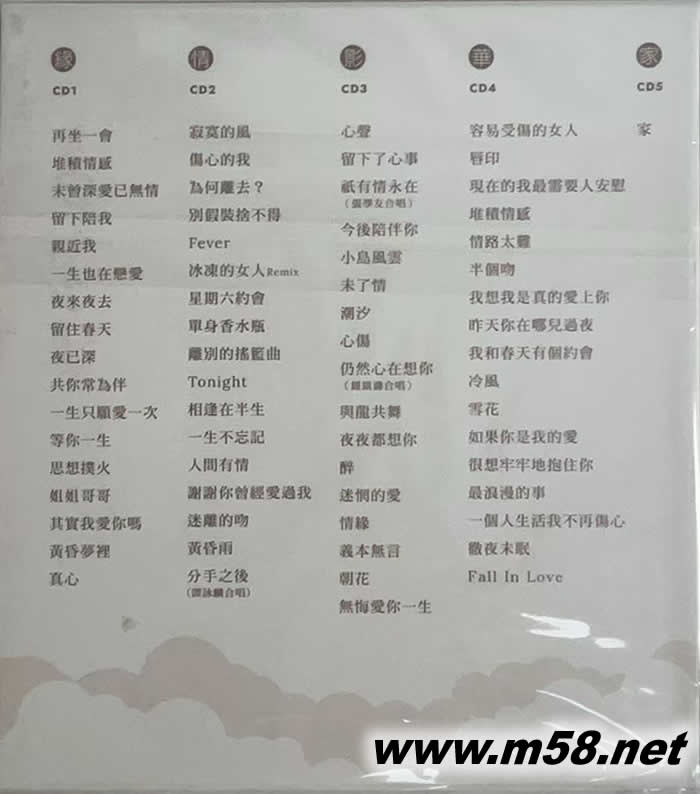 DISC 1 1 再坐一會 鄺美云 2 堆積情感 鄺美云 3 未曾深愛已無情 鄺美云 4 留下陪我 鄺美云 5 親近我 鄺美云 6 一生也在戀愛 鄺美云 7 夜來夜去 鄺美云 8 留住春天 鄺美云 9 夜已深 鄺美云 10 共你常為伴 鄺美云 11 一生只愿愛一次 鄺美云 12 等你一生 鄺美云 13 思想撲火 鄺美云 14 姐姐哥哥 鄺美云/ 羅堅 15 其實我愛你嗎 鄺美云 16 黃昏夢裡 鄺美云 17 真心 鄺美云 DISC 2 1 寂寞的風 鄺美云 2 傷心的我 鄺美云 3 為何離去? 鄺美云 4 別假裝捨不得 鄺美云 5 Fever 鄺美云 6 冰凍的女人 (Remix) 鄺美云 7 星期六約會 鄺美云 8 單身香水瓶 鄺美云 9 離別的搖籃曲 鄺美云 10 Tonight 鄺美云 11 相逢在半生 鄺美云 12 一生不忘記 鄺美云 13 人間有情 鄺美云 14 謝謝你曾經(jīng)愛過我 鄺美云 15 迷離的吻 鄺美云 16 黃昏雨 鄺美云 17 分手之后 鄺美云/ 譚詠麟 DISC 3 1 心聲 [無綫電視劇《摘星的女人》主題曲] 鄺美云 2 留下了心事 [無綫電視劇《富貴流氓》主題曲] 鄺美云 3 祇有情永在 [無綫電視劇《賊公阿牛》主題曲] 鄺美云/ 張學友 4 今后陪伴你 [無綫電視劇《青春家族》主題曲] 鄺美云 5 小島風云 [無綫電視劇《小島風云》主題曲] 鄺美云 6 未了情 [無綫電視劇《相愛又如何》主題曲] 鄺美云 7 潮汐 [電影《過埠新娘》主題曲] 鄺美云 8 心傷 [無線電視劇《摘星的女人》插曲] 鄺美云 9 仍然心在想妳 [電視劇《生命之旅》插曲] 鄺美云/ 鍾鎮(zhèn)濤 10 與龍共舞 [電影《與龍共舞》主題曲] 鄺美云 11 夜夜都想你 [無綫電視劇《神行太?!分黝}曲] 鄺美云 12 醉 [無綫電視劇《小島風云》插曲] 鄺美云 13 迷惘的愛 [無綫電視劇《獵鯊行動》插曲] 鄺美云 14 情緣 [無綫電視劇《飛越官場》主題曲] 鄺美云 15 義本無言 [電影《義本無言》主題曲] 鄺美云 16 朝花 [無綫電視劇《朝花夕拾》主題曲] 鄺美云 17 無悔愛你一生 鄺美云 DISC 4 1 容易受傷的女人 鄺美云 2 唇印 鄺美云 3 現(xiàn)在的我最需要人安慰 鄺美云 4 堆積情感 鄺美云 5 情路太難 鄺美云 6 半個吻 鄺美云 7 我想我是真的愛上你 鄺美云 8 昨天你在哪兒過夜 鄺美云 9 我和春天有個約會 鄺美云 10 冷風 鄺美云 11 雪花 鄺美云 12 如果你是我的愛 鄺美云 13 很想牢牢地抱住你 鄺美云 14 最浪漫的事 鄺美云 15 一個人生活我不再傷心 鄺美云 16 徹夜未眠 鄺美云 17 Fall In Love 鄺美云 DISC 5 1 家 鄺美云