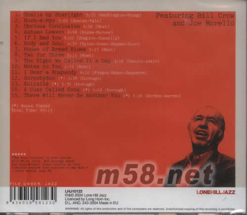 1.STELLA BY STARLIGHT5:55(WASHINGTON-YOUNG) 2.HUSH-A-BYE7:00(SEELEN-PAIN) 3.OBVIOUS CONCLUSION4:56(MOST) 4.AUTUMN LEAVES4:48(KOSMA-MERCER) 5.IF I HAD YOU5:02(SHAPIRO-CONNEIIY) 6.BODY AND SONL4:54(EYTO-GREEN-HEYMAN-SOUR)) 7.HOUSE OF BREAD BLUES5:17(MOST) 8.TWO FOR THREE5:12(MOST) 9.THE NIGHT WE CALLED IT A DAY3:18(DENNIS-ADAIR) 10.NOTES TO YOU2:55(MOST) 11.I HEAR A RHAPSODY4:10(FRAGOS-BAKER-GASPARRE) 12.SCROOBYDOO(*)3:38(DOROUGH) 13.EULLALLA(*)3:35(DOROUGH) 14.A CUSS CALLED COSS(*)4:03(DOROUGH) 15.THERE WILL NEVER BE ANOTHER YOU(*)4:30(GORDON-WARREN)