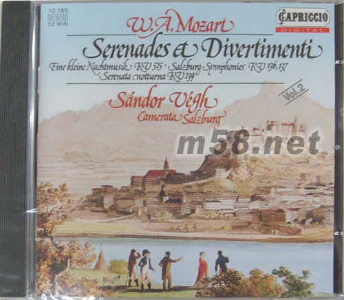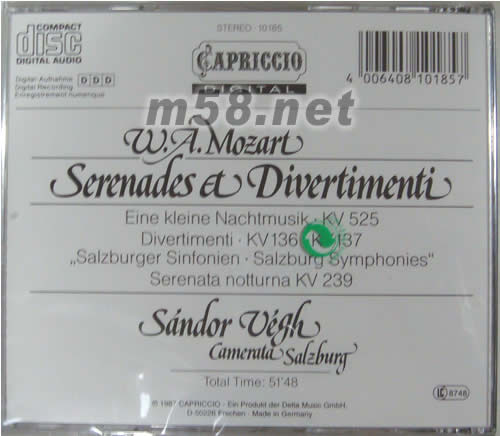 莫札特小夜曲與嬉游曲(m58.net) BEST OF MOZART 250JAHRE 250YEARS 莫札特小夜曲與嬉游曲 這張深受世人歡迎的發燒盤,收錄了莫札特最著名的作品再加上韋格優秀的演繹,而且CAPRICDO公司的錄音堪稱典范級高中低各個頻段都清晰扎實,整體效果平衡而充滿色彩感。著名的企鵝唱片指南給予三星評價,讓這張唱片無懈可擊。