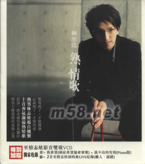 熟情歌(首批影音雙效版)(m58.net) 葡萄熟了才能釀酒,心成熟了才懂得愛。林志炫親自釀制,十首香氣滿溢《熟情歌》,紀念一路走過的青春腳印,唱出十種愛情的成熟心境,因此命名新碟為《熟情歌》。「說不出的告別」乃林志炫為回憶而創作之《熟情歌》,紀念那份珍藏的愛。此曲鋼琴版亦了輯錄于《至情志炫影音雙效》VCD內。 在《至情志炫影音雙效》VCD中,林志炫高唱為臺灣癌癥病患打造的歌曲「我希望」,為患者加油打氣,氣氛溫馨;碟內還收錄《至情志炫演唱會》Live紀錄中兩支歌曲︰「離人」及「認錯」。 前「優克李林」主音林志炫 2005 年憑著《至情志炫》專輯,再次入圍了金曲獎最佳國語男歌手,他這幾年一直以獨立制作的方式經營自己的歌唱事業,作品一再獲得金曲評審的肯定,各位又豈能錯過林志炫的「熟男」心聲!