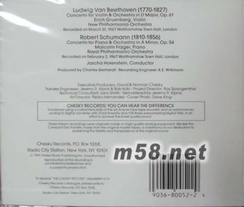 Luding van beethven(1770-1827) Concerto for Violin and Orchestra in D, Op. 61 Erich gruenberg,violin new philharmonia orchestra recorded on march 31,1967 walthmstow hall,london Robert schumann(1810-1856) Concerto for piano & Orchestra in A minor, Op. 54 Malcolm frager.piano royal philharmonic orchestra recorded on february 2.1967walthamstow hall.london Jascha Horenstenin,conductor produced by charies gerhardf.recording engineer:K.E.Wllkinson