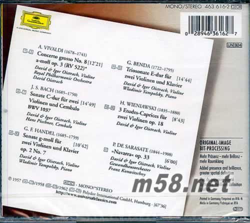 BACH HANDEL VIVALDI BENDA 大衛(wèi)父子小提琴名演集(大禾花版) 巴赫 亨德爾 威瓦爾蒂(m58.net) 由小提琴家、指揮家大衛(wèi)?奧伊斯特拉赫和他的兒子伊戈?duì)?奧伊斯特拉赫合作演出灌錄的這款《大衛(wèi) & 伊戈?duì)?奧伊斯特拉赫》,DG公司2000年出版發(fā)行。 這款《大衛(wèi) & 伊戈?duì)?奧伊斯特拉赫》,收錄了維瓦爾第的大協(xié)奏曲、巴赫的奏鳴曲等作品。 大衛(wèi)?奧伊斯特拉赫(David Oistrakh)是20世紀(jì)最能代表俄羅斯傳統(tǒng)的小提琴家。1908年,大衛(wèi)?奧伊斯特拉赫出生于烏克蘭奧德薩,5歲開始學(xué)習(xí)小提琴,1937年,他贏得布魯塞爾伊薩伊國(guó)際小提琴大賽首獎(jiǎng)。得獎(jiǎng)后的大衛(wèi)?奧伊斯特拉赫立刻得到世界各地樂(lè)迷的喜愛,俄國(guó)作曲家也因?yàn)樗x煌的演出技巧而改變作曲方向。大衛(wèi)?奧伊斯特拉赫對(duì)樂(lè)曲表達(dá)的可塑性極強(qiáng),琴音不但溫暖優(yōu)美而且活力充沛,而且演出曲目非常豐富,尤其擅長(zhǎng)19、20世紀(jì)作曲家米亞斯科夫斯基、哈恰圖良、肖斯塔科維奇、普羅科菲耶夫等俄國(guó)作品。 在這款專輯中,大衛(wèi)?奧伊斯特拉赫擔(dān)任指揮,率領(lǐng)英國(guó)皇家愛樂(lè)樂(lè)團(tuán),與他的兒子默契合作,為樂(lè)迷奉獻(xiàn)出一臺(tái)精彩的響宴。 專輯曲目