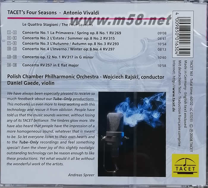 TACET’S FOUR SEASONS 膽咪四季(m58.net) TACET最知名的「真空管系列」又有新作推出! 這回請到曾經擔任過維也納愛樂小提琴首席、 日前領軍蓋德三重奏的Daniel Gaede率領「波蘭室內愛樂管絃樂團」 演出最經典的古典音樂曲目-韋瓦第的「四季」! 在TACET的王牌錄音師Andreas Spreer的巧手下, 已經典的M49真空管麥克風、V72真空管前級與W85等全真空管的設備完整表現出最自然透明的音質, 發揮出各種樂器最醇美的音質與音樂中豐沛的情感。 「四季」是巴洛克時期作曲家韋瓦第五十歲左右所寫的十二首協奏曲中的前四首, 以「和聲與創意的嘗試」為名, 每一首的標題附有一首描寫四季景致的十四行詩, 由快、慢、快三個樂章所組成。 從恬靜中蘊含無限生機的「春」、 慷慨激昂且充滿生命力的「夏」、 簫瑟卻莊重典雅的「秋」到溫和安詳的「冬」, 整首作品內容豐富多采,充滿詩情畫意,無怪乎成為古典樂迷最喜愛的曲目。 除了「四季」之外,這張專輯還收錄了另外兩首韋瓦第的協奏曲, 風格延續「四季」的華麗高雅。 蓋德的小提琴獨奏在里面有更吃重的演出, 快板激昂飽滿,慢板悠揚沈穩,將他手上的 J. B. Vuillaume 名琴的高貴音色完全展現, 肯定將會成為「真空管系列」中的最佳代表。