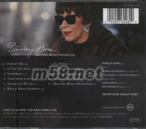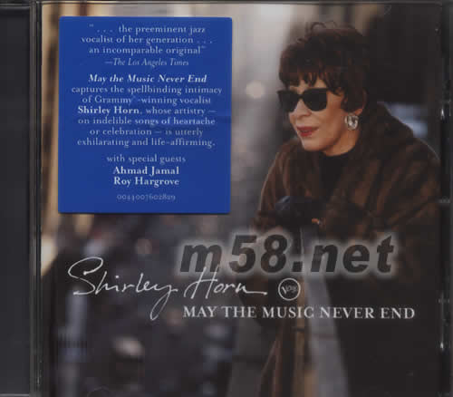 MAY THE MUSIC HEVER END(m58.net) SHIRLEY HORN 演唱 CEORGE MESTERHAZY:鋼琴 ED HOWARD:貝斯 STEVE WILLAMS :鼓 SPECIAL GUESTS AHMADJAMAL :鋼琴 ROY HARGROVE:翼鋼琴 一九六O年,當時還是小姑娘的霍恩來到紐約,錄制了她的第一張唱片,邁爾斯-戴維斯聽到之后,把小姑娘帶到了先鋒村(Village Vauguard)同自己一同演出,之后小姑娘用自己的歌喉與鋼琴征服了紐約大大小小的爵士酒吧。接下來發(fā)生的事情也許并不像輿論所宣揚的那樣不可理解:霍恩結(jié)婚之后,把所有的精力都用在了家庭和女兒身上,從爵士舞臺上悄然隱退,也許相比于做一名歌者,她更愿意做一個母親。所幸的是,一九八一年在當時荷蘭北海爵士節(jié)(North Sea Jazz Festival)的策劃保羅-阿基特(Paul Acket)的勸說下,霍恩又回到了她的鋼琴前。 她的笑容還是那樣親切,只是漸有了歲月的痕跡。她的歌聲還是那樣深情,有時似輕輕耳語,如《YESTERDAY》這首歌真的引人無限暇想,她的聲音真像母親的手,輕撫你的臉龐,非常的懷舊。