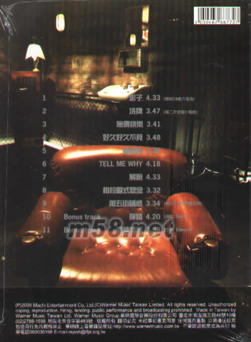 01. 影子(嫂嫂19歲片尾曲) 02. 洗牌(第二次求婚片尾曲) 03. 無價快樂 04. 好久好久不見 05. 都怪我 06. TELL ME WHY 07. 解脫 08. 柏拉圖式想念 09. 第五街誘惑(第五街牛仔褲廣告曲) Bonus track 10. 彈錯(演唱:Gabe) 11. 近情情怯(演唱:Edward)