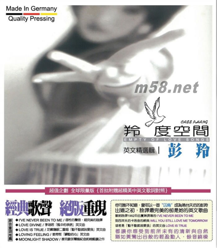 價格為估,以實到貨為準! 羚度空間(m58.net) 久違了的一張 彭羚 "羚度空間" 英文專輯 初生之犢的 彭 羚 展現了她最簡單、乾凈、自然的特質; 用最清亮、最渾厚的唱腔,娓娓道盡情歌最深處的感動。