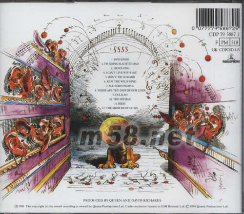 01. INNUENDO 02. I'M GOING SLIGHTLY MAD 03. HEADLONG 04. I CAN'T LIVE WITH YOU 05. DON'T TRY SO HARD 06. RIDE THE WILD WIND 07. ALL GOD'S PEOPLE 08. THESE ARE THE DAYS OF OUR LIVES 09. DELILAH 10. THE HITMAN 11. BIJOU 12. THE SHOW MUST GO ON