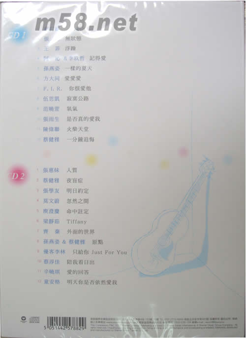 CD1 1 蘇打綠 小情歌 2 張懸 無狀態 3 王菲 浮躁 4 阿沁& 李玖哲 記得愛 5 孫燕姿 一樣的夏天 6 方大同 愛愛愛 7 F.I.R. 你很愛他 8 伍思凱 寂寞公路 9 范曉軒 氧氣 10 張雨生 是否真的愛我 11 陳偉聊 火柴天堂 12 蔡健雅 一分鐘追海 CD2: 1 張惠妹 人質 2 蔡健雅 夜盲癥 3 張學友 明日約定 4 莫文蔚 忽然之間 5 庚澄慶 命中注定 6 梁靜茹 Tiffany 7 齊秦 外面的世界 8 孫燕姿&蔡健雅 原點 9 優克李林 只給你just for you 10 蔡淳佳 陪你看日出 11 辛曉琪 愛的回答 12 童安格 明天你是否依然愛我