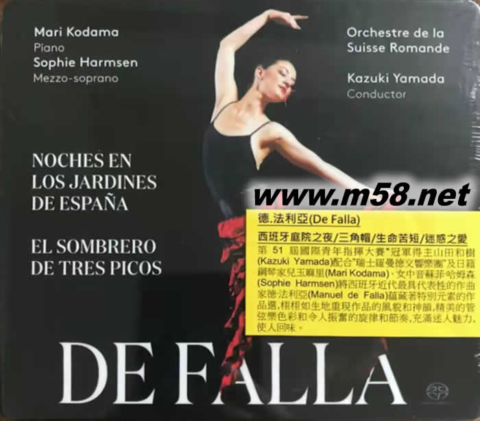 德•法利亞 [西班牙庭院之夜/三角帽/生命苦短/迷惑之愛]De Falla [Nights in the Gardens of Spain / The Three-Cornered Hat / Life is Short / The Bewitched Lov SACD(m58.net) 法雅:西班牙花園之夜、三角帽、生命苦短、迷惑之愛,瑞士羅曼德交響樂團(SACD),專輯收集了法雅最具影響力的作品,精美的管弦樂、令人振奮的旋律和節奏充滿魅力。德國壓制! Kazuki Yamada (conductor)、Mari Kodama (piano)、 Sophie Harmsen (mezzo-soprano)、Orchestre de la Suisse Romande 1. 西班牙近代最具代表性的作曲家德•法利亞(Manuel de Falla)以巧妙應用安達盧西亞(Andalucía)風格但又不受其束縛於他的作品之中見稱,因他與德彪西(Claude Debussy)及拉威爾(Maurice Ravel)的交往,其音樂也帶點印象主義(impressionism),而[西班牙庭院之夜(Nights In The Garden of Spain)]、[三角帽(The Three-cornered Hat)、[生命苦短(Life Is Short)]和[迷惑之愛(The Bewitched Love]就藴藏著這些特別元素,亦充份顯示作曲家橫溢的音樂天份和他作品的特性。 2. 第51屆國際青年指揮大賽(International Competition for Young Conductors)"首獎得主山田和樹 (Kazuki Yamada)與”瑞士羅曼德交響樂團(Orchestre de la Suisse Romande)有不少的合作,並已建立心有靈犀般的默契,這次再度合作,樂團在指揮悉心帶領下將德•法利亞數首最具影響力的作品發揮得淋漓盡致,精美的管弦樂色彩和令人振奮的旋律和節奏,充滿迷人魅力,使人回味。 3. 日籍鋼琴家兒玉麻里(Mari Kodama)那如大珠小珠落玉盤的琴音,與及女中音蘇菲•哈姆森(Sophie Harmsen)甜潤飄逸的嗓音,栩栩如生地將德•法利亞的作品的風貌和神韻重現。