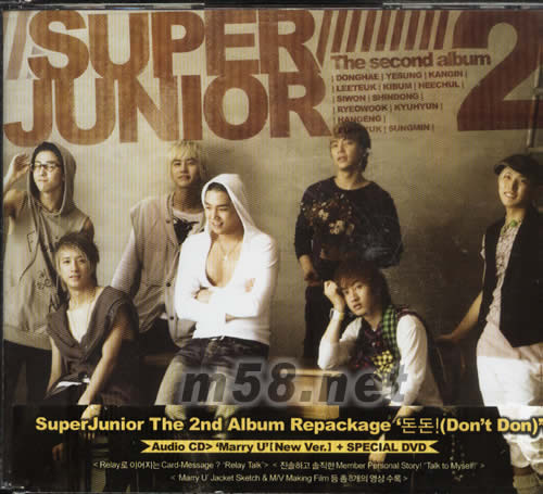第二擊C版(韓版)(m58.net) 海報尺寸:76*51CM 自一年前推出的《U》之後,Super Junior終于帶來第二張大碟《Don't Don》?!禗on't Don》以搖滾和R&B的曲風為主。由Yoon Jong Shin作曲的的士高風作品「Disco Drive」表現Super Junior的青春活力。舞曲「I Am」由李特、恩赫、晟敏和東海聯手作詞?!窶idnight Fantasy」則是80年代風的舞曲,另外他們也翻唱了Yoo Jae Ha的作品「Our Love」。至于ballad作品則有「She's Gone」、「Thank You」和「Marry U」。