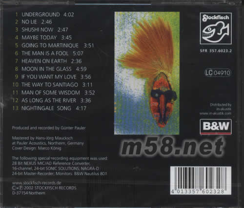 1.UNDERGROUND 2.NO LIE 3.SHUSHI NOW 4.MAYBE TODAY 5.GOING TO MARTINIQUE 6.THE MAN IS A FOOL 7.HEAVEN ON EARTH 8.MOON IN THE GLASS 9.IF YOU WANT MY LOVE 10.THE WAY TO SATIAGO 11.MAN OF SOME WISDOM 12.AS LONG AS THE RIVER 13.NIGHTINGALE SONG
