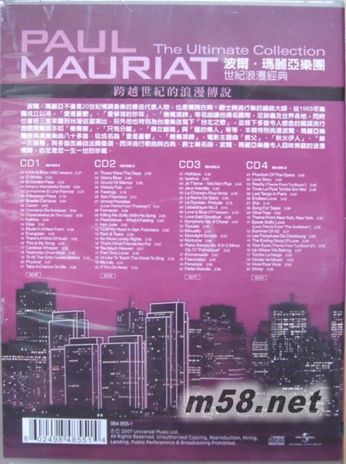 CD 1 66:39:00 1. Love Is Blue (1968Version) 2. El Bimbo 3. El Condor Pasa 4. (What A) Wonderful World 5. Un Homme Et Une Femme 6. A Summer Place 7. Brasilia Carnaval 8. Canon 9. Concierto De Aranjuez 10. Copacabana (At The Copa) 11. Kalinka 12. Elise 13. Etude In A New Form 14. Evergreen 15. There’s A Kind Of Hush 16. This Is My Song 17. Careless Whisper 18. Yesterday Once More 19. To All The Girls I Loved Before 20. Physical 21. Take A Chance On Me CD 2 63:03:00 1. Those Were The Days 2. Mamy Blue 3. Sound Of Silence 4. Melody Fair 5. Feelings 6. San Francisco 7. Almost Paradise (Love Theme From "Footlose") 8. Fernando 9. Killing Me Softly With His Song 10. Flashdance… What A Feeling 11. Hey Jude 12. I Left My Heart In Sanfrancisco 13. Rain & Tears 14. No More Lonely Nights 15. That’s What Friends Are For 16. Too Much Heaven 17. Part Time Lover 18. I’d Like To Teach The World To Sing 19. My Life 20. If You Go Away CD 3 63:11:00 1. Holidays 2. Isadora 3. Je T’aime… Moi Non Plus 4. Jeux Interdits 5. La Chanson Pour Anna 6. La Reine De Saba 7. La Traviata : Prelude 8. Liebestraum No.3 9. Love Is Blue (’77 Version) 10. Love Said Goodbye 11. Symphony No. 9 Choral 12. Toccata 13. Minuetto 14. Moonlight Sonata 15. Nocturne 16. Piano Sonata No. 8 In C Minor Op.13 "Pathetique" 17. Emmanuelle 18. Fascination 19. Penelope 20. Petite Melodie CD 4 63:24:00 1. Phantom Of The Opera 2. Love Story 3. Reality (Theme From "La Boum") 4. Toute La Pluie Tombe Sur Moi 5. Last Tango In Paris 6. Endless Love 7. She 8. Song For Taipei 9. Oliver Tree 10. Theme From New York, New York 11. Speak Softly Love (Love Theme From "The Godfather") 12. Summer Of ’42 13. Les Parapluies De Cherbourg 14. The Ending Song Of Love 15. Your Eyes (Theme From "La Boum 2") 16. Up Where We Belong 17. Tombe La Neige 18. Venise Va Mourir 19. Vivre Pour Vivre 20. Windy
