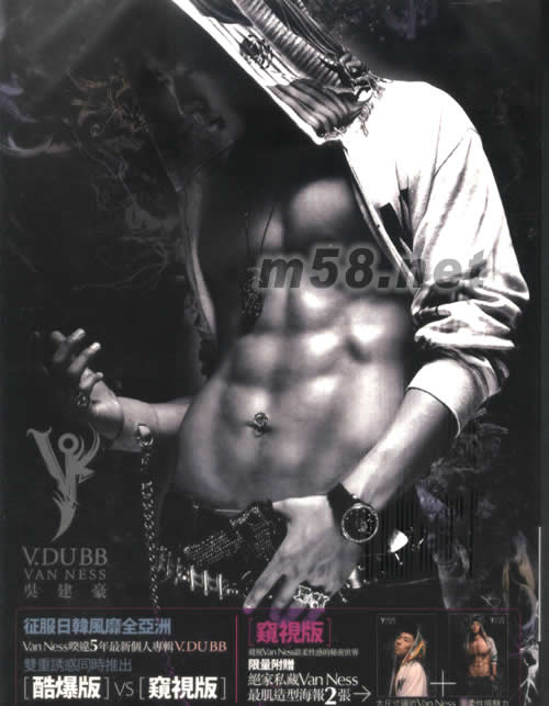 V.DUBB窺視版(m58.net) 征服日韓風靡全亞洲 VAN NESS睽達5年最新個人專輯V.DUBB 雙重誘惑同時推出 [酷爆版]VS[窺視版] [窺視版] 窺視VAN NESS溫柔性感的秘密世界 限量附贈 絕家私藏VAN NESS 最肌造型海報2張 VAN NESS 新手打造浪漫,性感.溫柔的V.DUBB音樂世界 [超性感推薦] [NEVER LET YOU GO]全美最熱URBAN GROOVE節奏 愛上了就絕不放手 體驗VAN NESS極致性感浪漫惹火魅力 [放手]VAN NESS 抒情唱功MAN展現窺見VAN NESS的溫柔男人心 讓人心碎的SMOOTH R&B [媽媽]"愛戀金飾"廣告曲VAN NESS千方百計從孔令奇手里要來的溫馨好歌獻給全天下媽媽的貼心感恩