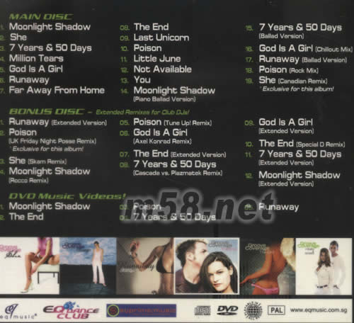 CD1 01:Moonlight Shadow 02:She 03:7 Years& 50 Days 04:Million Tesrs 05:God Is A Girl 06:Runaway 07:Far away From Home 08:The End 09:Last Unicorn 10:Poison 11:Little June 12:Not Available 13:You 14:Moonlight Shadow(Piano Ballad Version) 15:7 Years& 50 Days(Ballad Version) 16:God Is A Girl(Chillout Mix) 17:Runaway(Ballad Version) 18:Poison(Rock Mix) 19:She(Canadian Remix) CD2 01:Runaway(Extended Version) 02:Poison(UK Friday Night Posse Remix) 03:She(Skam Remix) 04:Moonlight Shadow(Rocco Remix) 05:Poison(Tune Up Remix) 06:God Is A Girl(Axel Konrad Remix) 07:The End(Extended Version) 08:7 Years& 50 Days(Cascada vs Plazmatek Remix) 09:God Is A Girl(Extended Version) 10:The End(Special D Remix) 11:7 Years& 50 Days(Extended Version) 12:Moonlight Shadow(Extended Version) DVD 01:Moonlight Shadow 02:The End 03:7 Years& 50 Days 04:Runaway