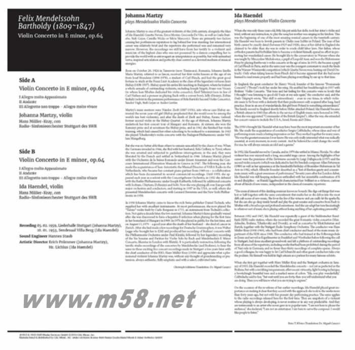 本張黑膠分別收錄匈牙利小提琴家 Johanna Martzy 與波蘭小提琴家 Ida Haendel 演奏孟德爾頌:小提琴協奏曲的珍稀錄音,兩人合作的指揮與樂團皆為 Hans Müller-Kray 與 Radio-Sinfonieorchester Stuttgart des SWR。