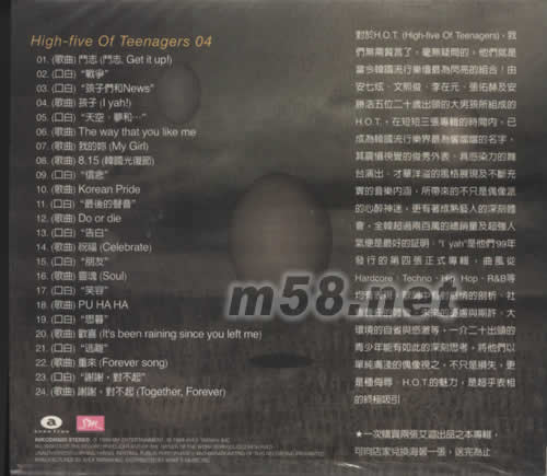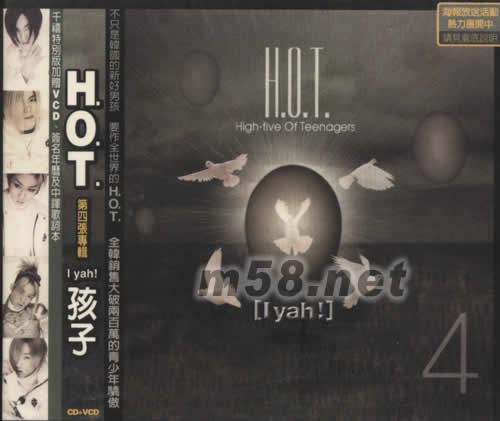 L YAH! 孩子(m58.net) 全韓銷量大破兩百萬的青少年驕傲 千禧特別版加贈VCD 簽名年歷及中譯歌詞本 韓國S.M.ENTAINMENT正式獨家授權 對于H.O.T.(High-five Of Teenagers),我們無需贅言了,毫無疑問的,他們就是當今韓國流行樂壇最為閃亮的組合!由安七炫、文熙俊,李在元、張佑赫及安勝浩五位二十歲出頭的大男孩所組成的H.O.T.,在短短三張專輯的時間內,已成為韓國流行樂界最為響當當的名字,其震懾視覺的俊秀外表、具感染力的舞臺演出、才華洋溢的風格展現及不斷充實的音樂內涵,所帶來的不只是偶像派的心醉神迷,更有著成熟藝人的深刻體會,全韓超過兩百萬的總銷量及超強人氣便是最好的證明。"I yah"是他們99年發行的第四張正式專輯,曲風從Hardcore 、Techno 、Hip Hop、R&B等均有表現,歌詞中有對感情的剖析、社會責任的體會、未來的憂慮與期許、大環境的自省與感激等,一介二十出頭的青少年能有如此的深刻思考,將他們以單純膚淺的偶像視之,不只是損失,更是種侮辱。H.O.T.的魅力,是超乎表相的終極吸引。
