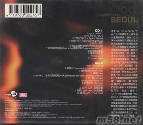 價格為估,以實到貨為準! 99 LIVE IN SEOUL 9/18漢城奧林匹克熱力實錄(m58.net) 這張‘99 LIVE IN SEOUL”在HOT的樂團歷史上具有極為重要的意義。首先,位于漢城的奧林匹克運動場是大韓民族奧運光榮的神對象徽,HOT則是首位得以舉行演唱會的演藝團體,象徽其地位非凡可見一斑;再者,本作品不但是HOT成軍以來的首張現場專輯,演出本身也是為久遠的第四張專輯“I YAH”之發行宣告儀式。這場盛會共吸引了上萬名歌迷共襄盛舉,門票也在三天內銷售一空。HOT除了演唱前三張專輯的經典歌曲如“斗魂”“海誓山盟”“戰士的后代”等之外,還有許多與歌迷們的感性對談,第四張專輯的斗志“,”歡喜“”靈魂“”DO LR DIE“也都有收錄,TITLE SONG”I YAH“管弦加搖滾樂近十分鐘的超長史詩版更是讓全場沖到最高峰。可說是樂團經典時刻的最佳見證!在韓國當地此專輯已成為流行樂的經典收藏之一,臺灣的樂迷們當然也不可錯過!