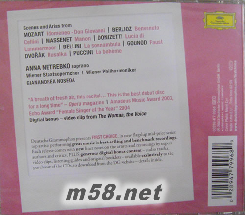 Opera Arias FIRST CHOICE 首選歌劇(m58.net) ◎葛濟夫最鐘愛的歌劇女伶‧當今樂壇最耀眼的女高音新秀 ◎安娜‧聶翠柯,女高音/諾西達指揮維也納愛樂管弦樂團 安娜‧聶翠柯是現今歌劇舞臺最受矚目的年輕女高音,一九七一年出生於俄羅斯南方的克拉斯諾達爾,在圣彼得堡音樂學院接受音樂教育,一九九三年在莫斯科葛令卡聲樂大賽中得到首獎后,加入圣彼得堡馬林斯基劇院,成為俄羅斯境內最受矚目的美麗新星。在葛濟夫的提拔下,年輕的聶翠柯在一九九五年畢業后,立刻站上美國舊金山歌劇院的舞臺。接下來數年里,聶翠柯不但在多個國際聲樂大賽中獲獎,也成為各大重要歌劇院的常客。除了俄羅斯歌劇,聶翠柯的演唱曲目包括威爾第《茶花女》、莫札特《唐喬望尼》、羅西尼《塞維亞的理髮師》等。這張專輯精挑出最適合聶翠柯的幾首歌劇詠嘆調,展現她美麗外貌下最耀眼的光芒。