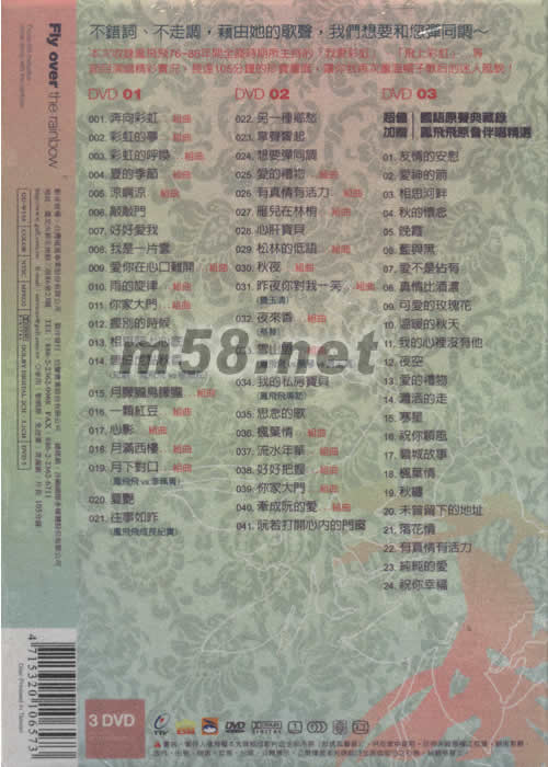 飛上彩虹 76-86 電視演唱精選DVD(m58.net) 內含39首歌詞 及珍貴寫真 不錯詞、不走調,藉由她的歌聲,我們想要和您彈同調~ 本次收錄鳳飛飛76-86年間全盛時期所主持的[我愛彩虹]、[飛上彩虹]...等節目演唱精彩實況,長達105分鐘的珍貴畫面,讓你我再次重溫帽子歌后的迷人風貌!