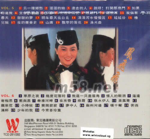 Vol.5 01 另一種鄉愁 02 溜溜的她 03 遠去的人 04 跳呀!打開那扇門 05 如果你是我 06 交會的云朵 07 早春 08 吹過來的愛 09 敲敲門 10 踢踏踩 11 我倆有春天 12 甜甜的夢 13 明年春天在臺北 14 清清河水慢慢流 15 娃娃谷 16 櫓兒搖 17 夜的羅曼史 18 山鷹 19 飄零的落花 20 漁光曲 Vol.6 01 草原之夜 02 幾度花落時 03 我是一只畫眉鳥 04 情人的眼淚 05 遙遠寄相思 06 藍與黑 07 秦淮河畔 08 夜來香 09 晚霞 10 秋水伊人 11 茶葉青 12 蘋果花 13 小時候 14 蘭閨寂寂 15 夢中人 16 蘇州河邊 17 嘆十聲 18 苦酒滿杯 19 少年的我 20 今宵多珍重