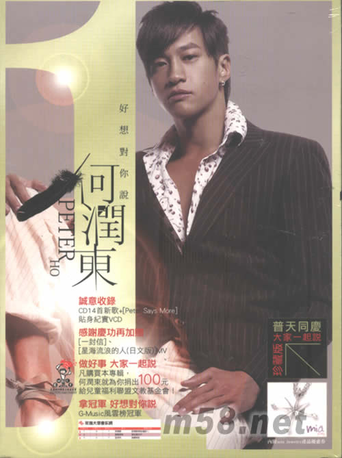 好想對(duì)你說(shuō)(臺(tái)灣珍藏版)(m58.net) 誠(chéng)意收錄CD14 首新歌 +[Peter Says More] 貼身紀(jì)實(shí)VCD 感謝慶功再加贈(zèng) [一封信]、[星海流浪的人(日文版)MV 做好事 大家一起說(shuō) 凡購(gòu)買本專輯, 何潤(rùn)東就為你捐出100元給兒童福利聯(lián)盟文教基金會(huì)! 拿冠軍 好想對(duì)你說(shuō) G-Music 風(fēng)云榜冠軍 感謝每一位相信夢(mèng)想的你 收藏最完整的何潤(rùn)東 一封信 何潤(rùn)東首度作詞 獻(xiàn)給歌迷的親筆感謝 游鴻明感動(dòng)譜曲 星海流浪的人 迷離情節(jié)戲劇入歌 何式K歌新典范 好想對(duì)你說(shuō) 張娜拉跨刀甜蜜對(duì)唱 浪漫時(shí)刻必備曲 黑色翅膀 百萬(wàn)征歌優(yōu)勝歌曲 何潤(rùn)東首度執(zhí)導(dǎo)MV 雙飛 電視劇[梁山伯與祝英臺(tái)]片尾曲 白屋之戀 同名電視劇主題曲 無(wú)我 線上游戲[如來(lái)神掌]代言主題曲