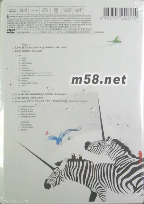 Disc 1 01. Live & Documentary scene -1st.part 02. Live scene -1st.Part SE...。 01. jump 02. Grip! 03. self reliance 04. flavor 05. stray cat 06. Time goes by 07. For the moment 08. 出逢 09. nostalgia 10. fragile 11. (When)Will It Rain 12. キヲク Disc 2 01. Live & Documentary scene -2nd.part 02. Live scene -2nd.part 03. Bonus Track Video Clip(2003 tour edition) 13. AMBIVALENCE 14. Shapes of love 15. Future World 16. Dear My Friend 17. UNSPEAKABLE ENCORE 01. Free Walkin 02. 輕聲祈禱 03. 愛の謳