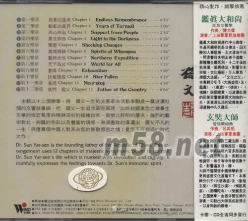 國父孫中山(交響敘事曲)(m58.net) 國父逝世七十周年紀念專輯 獻給所有追懷孫中山先生的中國人 本輯以十二個樂章,將國父一生的主要革命活動串聯成一篇波瀾壯闊的交響敘事曲,把國父一生追求革命真理,以拯救國家危亡為畢生志業的恢宏氣度與精神深刻的描繪出來。音樂以鮮明的層次、強烈的藝術對比、絢麗的色彩以及豐富的情感,淋漓盡致的揮灑出國父不凡的一生,與億萬個中國人對其永恒的崇敬思念之情;是您不可錯過的時代之作。