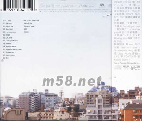 Can't Buy My Love (初回限定盤)(m58.net) 2006年FROM ME TO YOU一鳴驚人日本具潛質與人氣唱作女歌手YUI,2007年全新專輯CAN'T BUY MY LOVE繼續俘虜樂迷的心靈. 大碟收入13首歌曲,包括《太陽之歌》的主題曲「Good-bye days」、「I remember you」、「Rolling star」和「CHE.R.RY」等歌曲。