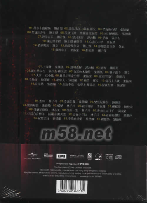 1 萬水千山縱橫- 關正杰 2 鐵血丹心- 甄妮, 羅文 3 情義兩心堅- 張德蘭 4 英雄出少年- 關正杰 5 笑傲江湖- 葉麗儀/葉振棠 6 何日再相見- 張德蘭 7 碧海青天- 關正杰 8 楚河漢界- 譚詠麟 9 楚歌- 張學友 10 倆忘煙水裡- 關正杰,關菊英 11 忘盡心中情- 葉振棠 12 名劍風流- 羅文 13 情受幾多哀- 關正杰 14 夢想號黃包車- 甄妮 15 戲班小子- 葉振棠 16 醉紅塵- 關正杰 唱碟 2 1 上海灘- 葉麗儀 2 誰可改變- 譚詠麟 3 過客- 關菊英 4 祇有情永在- 張學友, 鄺美云 5 女黑俠木蘭花- 葉麗儀 6 獅子山下- 羅文 7 大亨- 徐小鳯 8 難為正邪定分界- 葉振棠 9 風霜伴我行- 鄧麗君 10 今晚夜- 陳潔靈 11 網中人- 張德蘭 12 親情- 羅文 13 當我人去后- 葉振棠 14 茫茫路- 張德蘭 15 長流不息- 張學友, 黎瑞恩 16 星夜星塵- 陳潔靈 唱碟 3 1 想你- 林子祥 2 幸運是我- 葉德嫻 3 變幻是緣份- 鐘鎮濤 4 愛的短箭- 張德蘭 5 蝶變- 林子祥 6 殺手神鎗- 李振輝 7 蝴蝶夢- 陳秋霞 8 什麼是緣份- 林志美 9 他的一生- 林子祥 10 奔向未來日子- 張國榮 11 仍然心在想你- 鐘鎮濤, 鄺美云 12 青春少年時- 林子祥 13 青春的烙印0 蔣麗萍 14 寂寞是我- 張德蘭 15 不捨他為愛- 葉德嫻 16 親愛的- 劉德華