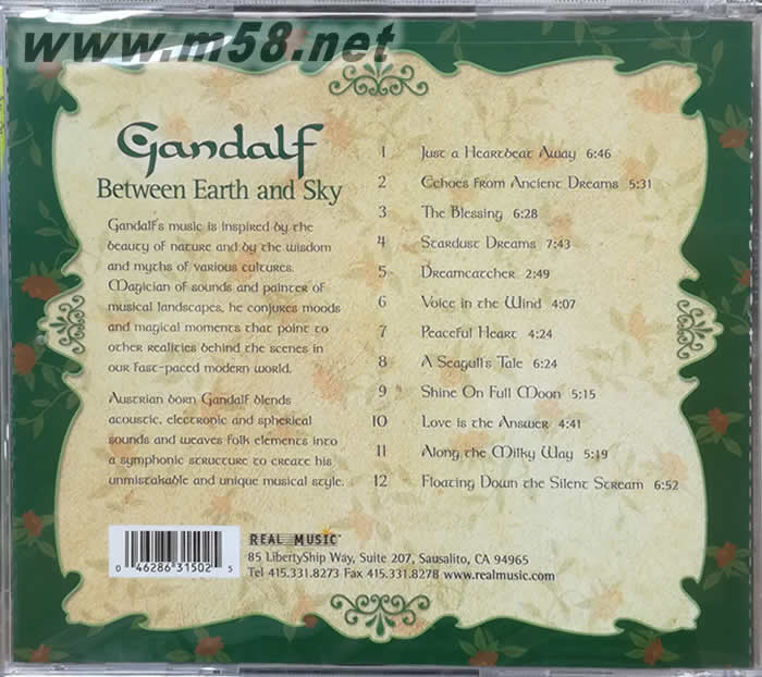 擅長演奏多種樂器的音樂大師Gandalf是Real Music老板Terence Yallop從歐洲發掘的新世紀樂壇新星。然而一段較長的時間里面,Gandalf和他的音樂只在歐洲地區為人知曉,世界其他地方的新世紀音樂愛好者并不知道他。帶來轉機的是《Between Earth And Sky 天地之間/天地遨游》這張專輯,這是Gandalf登陸北美地區的首張專輯,從而讓Gandalf以及他的音樂在北美這個最大的音樂消費市場一炮而紅,進而推向世界。