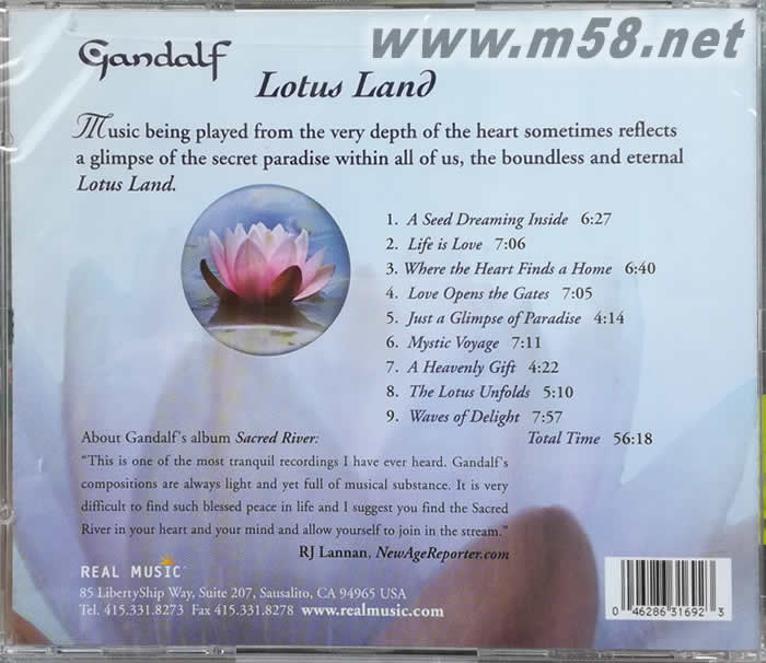 蓮花美地 吉它大師GRNADALF 新世紀純音樂(m58.net) 蓮花美地—GANDALF 全能音樂大師GANDALF,一手包辦作曲,編曲,演奏,監制于一身,創作及演奏9首優美動聽的作品,鋼琴,結他,印度SITAR,BOUZUKI,敲擎全部親自演奏,充滿自然平和的旋律,細致動人的音符,令聽從心醉神馳。 甘道夫(Gandalf)出生于奧地利,曾遍游歐洲、北美、南美和亞洲。他對所到之處的文化了解越多,就越被這種現實所觸動——在我們這個行星上,不同種族人民之間的共同點遠比分歧要多。他創作和錄制唱片的目標是創造消除隔閡的音樂。 甘道夫的音樂是從自然美和各種文化與神秘中得到靈感,這張《蓮花美地》專輯正是他有名的代表作之一。 《蓮花美地》是甘道夫2007年的個人專輯,他通過這張專輯告訴我們:我們內心深處一直向往著的一個地方——“那里的所有生物都可以生活在一個理想的、和諧與和平的環境中”。而這一愿望是我們發自內心的一種意識形態,純潔得就像這美麗的睡蓮。 甘道夫演奏多種多樣的樂器(聲學吉他與電吉他、錫塔爾琴、薩斯、Charango、布祖基琴、Balaphon、鋼琴、電子合成器和脈沖采樣鍵盤,以及各種打擊樂器),混合了電子和天空的聲音,并將民族元素編入了交響樂結構中以創造其明顯而獨特的風格。
