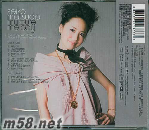 My pure melody(m58.net) ◎80年代的奇蹟,永恆的少女松田圣子2008年度代表作 ◎加贈典藏少女影像DVD,收錄「花紛飛舞的季節(jié)裡」音樂錄影帶及夏威夷拍攝花絮! ◎少女圣子迷你寫真本封入,精美彩照CD印刷豪華加值雙片裝! 在春天,看見了永恆的松田圣子… 日本歌壇不朽的傳奇,永遠(yuǎn)的少女松田圣子2008年年度代表作專輯「My pure melody」終於問世!陪伴大家走過青春時光的圣子,時間似乎沒有在她身上留下痕跡,超值加贈的DVD及迷你寫真中,你可以看到宛如少女的圣子,專輯以圣子擅長的中板曲風(fēng)為主,是一張整張充滿了松田圣子風(fēng)格的專輯。配合春夏季節(jié),圣子也特地?fù)Q上了粉嫩的春裝,這張春意盎然的專輯,將會是你留住2008年的最佳回憶。 專輯中特別加贈了少女影像DVD,收錄「花紛飛舞的季節(jié)裡」音樂錄影帶及夏威夷拍攝花絮,更破天荒的贈送圣子在夏威夷拍攝的迷你寫真本,物超所值,聽覺視覺都是最松田圣子的一張代表作。