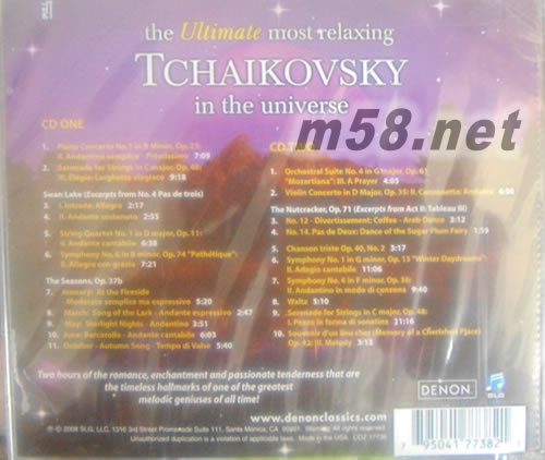 舒緩境界(紅色封面)THE ULTIMATE MOST RELAXING CLASSICAL IN THD UNIVERSE(m58.net) 美國著名古典音樂品牌DENON輯錄旗下多段著名錄音,名師演繹,由亮麗的弦樂至鏗鏘的琴韻,帶給聽眾兩個小時的平和減壓空間,原裝美國版重新混音推出。