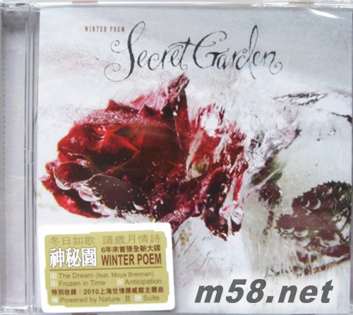 WINTER POEM 冬之詩(港版)(m58.net) 15年來的全世界的銷售量接近5百萬 11首全新創作歌曲, 以純音樂為主 *重點推介歌曲 "The Dream" 請來歌手Moya Brennan作主音, 加上那弦樂配樂和人聲和音, 完全地表達出夢境中那種朦朧而柔和的感覺。 *另一首歌曲"Mary's Lament" 由 Brendan Graham("You Raise Me Up" 作詞人) 作詞, Fionnuala Gill主唱。 *碟中第10首歌 "Powered By Nature" 是2010年上海世博挪威展館的主題音樂, 由神秘園和捷克國家交響樂團演奏。