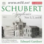 FRANZ SCHUBERT Symphony No.3, D 200 (1815) 22:15 in D major 1.Adagio maestoso - Allegro con brio8:34 2.Allegretto4:04 3.Menuetto. Vivace - Trio - Menuetto da capo3:38 4.Presto vivace5:51 Symphony No.5, D 485 (1816) 27:13 in B flat major 5.Allegro7:18 6.Andante con moto8:13 7.Menuetto. Allegro molto - Trio - Menuetto da capo4:41 8.Allegro vivace6:52 Symphony No.8, D 759 'Unfinished' (1822) 24:22 in B minor 9.Allegro moderato13:31 10.Andante con moto10:45 Total time: 74:11 Orchestra: City of Birmingham Symphony Orchestra Zoë Beyers leader Conductor: Edward Gardner