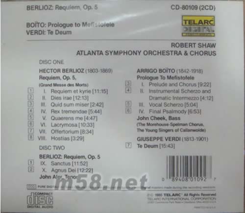 柏遼茲 安魂曲(m58.net) 氣勢懾人的合唱聲響 以《幻想交響曲》被愛樂者所熟知的浪漫派標題音樂大師白遼士,《安魂曲》是其另一重要之代表作,作曲家使用了大樂團及大合唱團的編制,營造出歌曲所蘊含的肅穆崇敬之氣氛,《末日經(jīng)》中聲勢懾人之銅管音響,令人不免對死亡寒顫不已。十九世紀末的義大利作曲家兼劇作家包伊多,曾為威爾第寫過《奧泰羅》及《法斯塔夫》之劇本,懾人的合唱與樂團的默契皆為十分完美之組合。歌劇《梅菲斯多菲》是包伊多人聲樂曲之代表,風格近似威爾第,為典型的義大利式歌劇。羅伯‧蕭以詮釋合唱曲之功力被譽為當今合唱音樂界之泰斗,名曲輔以發(fā)燒級人聲錄音之名碟,愛樂者不容錯過!榮獲TAS、葛萊美獎及三星帶花名盤。