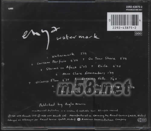 Watermark(m58.net) 該專輯取得了出人意料的好成績,單曲《orinoco flow》在英國成為排行榜冠軍曲,此專輯的全球銷量為 4000 萬張,僅在英國就有超過 100 萬張的銷量 "Watermark"共收錄11首單曲,其中包括三首演奏曲;而其馀8首演唱曲中,又有4首是以愛爾蘭語寫就的。 這些歌曲的特色,是氣氛與意象的傳達,重於文詞的描述。"Watermark"的文字風格具有詩意,卻也因而顯得 有些含糊曖昧,只能由不斷出現的「水」的意象,隱約感受到她對生命無常的傷感,和對童年時光的眷戀。 "Watermark"最成功之處,在於氣氛的營造與渲染。利用混聲合成效果,將各種樂器與人聲重復交疊灌錄,使簡單的旋律, 充滿音質變化,凡其在節奏變幻,聲音強調與馀音收尾上,更掌握得離淋漓精確,達到穠纖適度的完美境界。這應歸功於 她早年古典音樂與幕後配樂的多年訓練。 專輯中另一特色為贊美詩式宗教曲風的應用。也許這不應視為Enya音樂的特色,只是在"Watermark"中,以她純美的嗓音, 采用贊美詩式的吟詠唱法,夠能烘托對生命的無限感懷。 「水」是這張專輯中重要的意象,由同名單曲 "Watermark"引出專輯主題。在寧靜有致的鋼琴聲中,一波波人聲襲來, 彷佛平靜的水面,泛起一波波漣漪,襲襲的微風,吹拂過一望無際的水面。這是生命的起源,是思念的所在,也是一切憂傷的 洗滌處。在另一首演奏曲"River"潺潺的逝水中,一切哀愁消失殆盡,只覺眼前清朗開闊。