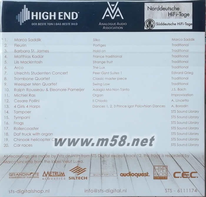 High End Society (德國高級音響協會) + AAA ~ Analogue Audio Association (德國模擬音頻協會) + STS Digtial合作,發燒至極,示范天碟,首批推廣價,限量發行,硬紙套包裝(Paper Sleeve Package)。