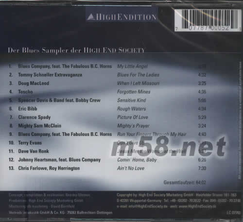 測試 5 High Endition Volume 5(m58.net) 自從試聽並推介過德國高級音響協會推出的「作品六號」之后,我便決心聽回前五張事輯 ,聽過這張以怨曲為主的 《Blues Sampler》,我恨不得想即時擁有其余同系靚碟,本碟集合了Telac、Opus3、Audioquest等各大品牌的十三首皇牌怨曲錄音,每首作品的精彩程度「迫」我頭一次聽便用了兩個多少時(即聽完立刻encore多一次),更使我耳界大開的,全碟網盡不同類型的怨曲外,演奏的樂器也是獨沽一味的結他,只聽尾二那首《Coming Home, Baby》的現場錄音已足夠理由擁有本碟,最后兩分鐘的笛子Solo可說技驚四座,音色及空氣感同樣靚到盡,其他的錄音室製作呢?放心,有這么大的音響協會作后盾,音效不夠班又豈能容身其中呢!如第七首《Picture of Love》來自一個陌生的唱片品牌Evidence,但音效卻是全碟最佳的頭幾位之一,人聲、結他、鼓聲及色士風的像真度均達鑑聽級水平。