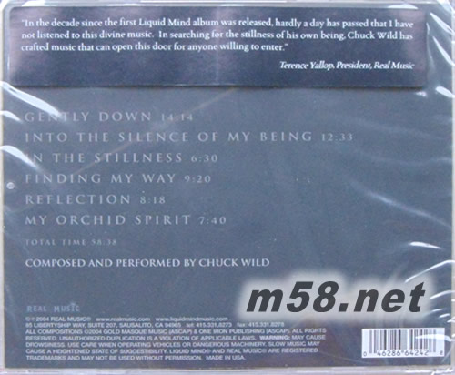 Liquid Mind VII Reflection 沉思 新世紀純音樂(m58.net) 本專輯REAL唱片公司官方試聽網址:片段 http://www.realmusic.com/shop/liquid-mind-vii-reflection/prod_89.html 一張適宜瑜伽或按摩時使用的音樂專輯 《Liquid Mind VII: Reflection》是作曲家查克·威爾德(Chuck Wild)以Liquid Mind的名字出版的一系列New Age專輯之一。Liquid Mind系列從1995年到2006年一共出版了八張。Chuck Wild在這一個系列作品的創作中,主旨是通過沉思與放松來傳遞一種深邃而雋永的平靜。 Liquid Mind是一個系列的舒緩的療傷音樂,為了滿足人們對有質量的休息的高端需求而誕生的。人們一生中幾乎有三分之一的時間是花在睡眠上的,怎么去專注提高預睡的效率對長期的健康生活是個好的投資。Liquid Mind其實就是這么個深度鎮靜劑,也容易被耳朵接受,是能使人們度過一個美好夜晚的完美伴侶。