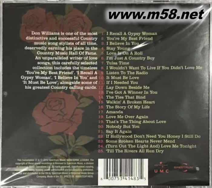 IT MUST BE LOVE 鄉(xiāng)村 情歌精選(m58.net) 老牌鄉(xiāng)村巨星時隔八年全新大碟,再現(xiàn)傳統(tǒng)優(yōu)美鄉(xiāng)村民謠 73歲的老牌天王老當益壯之作 已經(jīng)73歲的老牌鄉(xiāng)村巨星Don Williams最近發(fā)行了自己音樂生涯的第三十張專輯,距離上張專輯My Heart to You已經(jīng)過去了長達8年的時間。所有人都認為已經(jīng)處于古稀之年的Don估計要隱退樂壇了,這一生的音樂生涯也足夠完美了,誰知道8年后,老天王再次新簽下新東家,著名蘭草廠牌Sugar Hill Records復出,并且發(fā)行了自己的第三十張專輯!這個老將依舊有著無限的音樂激情和充沛的精力。 這應該是今年發(fā)行的鄉(xiāng)村專輯中,最最最優(yōu)美的一張專輯了。Don依舊奉獻出最動人,最溫暖人心的Ballad。作為經(jīng)歷鄉(xiāng)村樂幾十年進化的老Don,即使在當下音樂環(huán)境下做專輯,也同樣保持傳統(tǒng)鄉(xiāng)村音樂的本質和優(yōu)美。專輯實在是太好聽了,都是柔美溫馨的鄉(xiāng)村民謠,所有歌曲都是Don的創(chuàng)作,都是這個老人對于自己的生命中的愛情,友情,親情的贊美和歌頌,充滿著感動和懷念以及淡然,這也充分體現(xiàn)了已經(jīng)73歲的老Don,一個老人最完美和自然的生活狀態(tài)。 專輯所有歌曲都極其精美,制作都十足上層;特別要大贊Don的演唱以及他的狀態(tài),作為已經(jīng)73歲的Don,能有這樣的的演唱能力和控制力太讓人驚異了,這演唱功力絲毫不比任何一個年輕的鄉(xiāng)村男歌手差一丁半點,讓人驚異73歲還有這樣的狀態(tài),不愧是老牌天王。有著“溫柔的巨人”之稱的Don,在這張專輯依舊奉獻出他最溫暖和柔和的嗓音。這是一張足夠養(yǎng)耳和溫暖你內心的專輯,鄉(xiāng)村樂迷不可錯過。 有著“溫柔的巨人”之稱的Don Williams,是美國鄉(xiāng)村音樂歷史上鉆石天王級別的人物;自1966年發(fā)行了自己第一張專輯以來,叱咤美國樂壇長達50年,期間炮制無數(shù)美國至今都耳熟明詳?shù)慕?jīng)典鄉(xiāng)村金曲,至今擁有17首冠軍單曲,多張白金和金唱片,美國鄉(xiāng)村音樂中最為關鍵和里程碑式的人物,在美國鄉(xiāng)村民謠音樂的發(fā)展過程中,Don Williams也有著舉足輕重的作用; 有著低沉,溫柔和干凈的嗓音是Don Williams的殺手锏,堪稱歷史黃金嗓音之一,無數(shù)人都都為之傾倒,同時他歌聲和專輯也是最為著名的試音碟和音響測試最愛用的標準。雖然至今早已進入古稀之年,但是依舊充滿著音樂的激情和保持著驚人的狀態(tài),真心感嘆和崇拜這位傳奇性的人物。對于今年這張專輯,能讓73歲的老Don再度出山,堪稱樂迷的耳福了,希望這個老牌天王能安享晚年,當然,如果還有像今年這樣的專輯的發(fā)行,那真是樂迷最大的福氣了