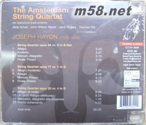 海頓弦樂四重奏第2輯 (Haydn String Quartet Vol.2) SACD(m58.net) 阿姆斯特丹弦樂四重奏(The Amsterdam String Quartet)]醉心於歷史悠久的古典名曲,他們亦深受被譽為"交響曲之父"的奧地利音樂家海頓(Franz Joseph Haydn)的作品所著迷,上輯<海頓弦樂四重奏第1輯>自推出后大獲好評,深受各界推崇。最新專輯<海頓弦樂四重奏第2輯(Haydn String Quartet Vol.2)>再將海頓三首最具欣賞價值的樂章包括[降E大調(diào)弦樂四重奏作品64.6,HobIII(String Quartet opus 64 nr.6 in E-flat)]、[G大調(diào)弦樂四重奏作品77.1,HobIII(String Quartet opus 77 nr.1 in G)]及[D大調(diào)弦樂四重奏作品20.4,HobIII(String Quartet opus 20.4,HobIII)]等,好讓您再次細聽這些截然不同的古典美樂,經(jīng) 阿姆斯特丹弦樂四重奏以嫻熟合拍的默契,演奏得心應(yīng)手,配合極具美感。以專業(yè)頂級的SACD製作后,樂章顯得更為美侖美煥,極富現(xiàn)場感!
