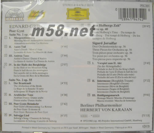 1. Peer Gynt Suite No.1, Op.46 Morning mood 2. The Death of Aase 3. Anitra`s dance 4. In the Hall of the Mountain King 5. Peer Gynt Suite No.2, Op.55 The Abduction (Ingrid`s lament) 6. Arabian dance 7. Peer Gynt`s return 8. Solveig`s song 9. Holberg Suite, Op.40 Präludium (Allegro vivace) 10. Sarabande (Andante) 〔4:16〕 11. Gavotte (Allegretto) - Musette (poco più mosso) - Gavotte 12. Air (Andante religioso) 13. Rigaudon (Allegro con brio) 14. Sigurd Jorsalfar, three Orchestral pieces Op.56 Prelude: In the King`s Hall (Op.22 No.1) 15. Intermezzo: Borghild`s Dream (Op.22 No.2) 16. Homage March (Op.22 No.4)