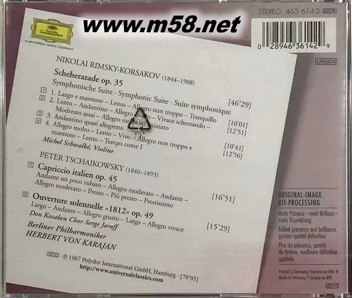 卡拉揚 - 里姆斯基-柯薩科夫:天方夜譚組曲 & 柴科夫斯基:1812序曲Rimsky-Korsakov: Scheherazade & Tchaikovsky: 1812 Overture 大禾花版(m58.net) DG公司這款《里姆斯基-柯薩科夫:天方夜譚組曲 & 柴科夫斯基:1812序曲》CD,于2000年出版發行,由指揮大師赫伯特?馮?卡拉揚指揮柏林愛樂樂團演出灌錄。 柴科夫斯基的《1812序曲》完成于1880年10月,是尼古拉?魯賓斯坦委托柴科夫斯基為莫斯科藝術工業博覽會創作的作品,也是柴科夫斯基最受人們歡迎的作品之一。作品于1882年8月8日首次演出時,就受到了聽眾極其熱烈的歡迎。音樂中所表現出來的愛國主義思想,加上樂隊宏大的氣勢以及樂曲末段的鐘、鼓和排炮齊鳴的熱烈氣氛,使當時的聽眾非常興奮,演出獲得了極大的成功。演出中動用了超大規模的樂隊,并在結尾處加了一個軍樂隊,還動用了大炮。這部序曲能為柴可夫斯基贏得聲謄并被推為他的代表作品,是作者沒有預料到的。 里姆斯基-柯薩科夫的《天方夜譚組曲》作于1888年,同年在彼得堡首演。《天方夜譚組曲》取材于著名的阿拉伯民間故事集《一千零一夜》。里姆斯基-柯薩科夫在初版總譜上介紹了原作的梗概:古代阿拉伯的蘇丹王沙赫里亞爾專橫而殘酷,他認為女人皆居心叵測而不貞,于是他每天娶一位新娘,次日便處死。機智的少女山魯佐德嫁給這位蘇丹王之后,在當夜給蘇丹王講了一個離奇生動的故事。第二天,這個故事正講到關鍵之處,被山魯佐德的故事所深深吸引的蘇丹王,為了繼續聽下去,破例沒有處死山魯佐德這位新娘。之后,山魯佐德又以同樣的方式給蘇丹王講了一連串的動聽故事,一直講了一千零一個夜晚。最后,蘇丹王被山魯佐德的故事所感化,終于徹底放棄了殘酷的念頭,決心與山魯佐德白頭偕老。 《天方夜譚組曲》全曲共分為四個樂章,在最早出版的總譜中,每個樂章均附有標題,標題內容取自《一千零一夜》里的故事:第一樂章“海洋與辛巴達的船”;第二樂章“卡倫德王子的故事”;第三樂章“王子與公主”;第四樂章“巴格達的節日,大海,船在聳立著青銅騎士的巖石旁遇難,終曲”。但在重版時,作者將各樂章的小標題全部刪去了。看來作者后來并不希望本曲具有過于明確的標題內容。在這首富于造型性、色彩性的組曲中,里姆斯基-柯薩科夫充分發揮了他的造型能力與幻想力。在這里起著重要作用的不是情緒的緊張度和戲劇性,而是色彩和裝飾的對照性配置,是優美的節奏和出色的表現力。在這部大規模展開的東方風格的交響組曲中,有著用音響來表現的風光景物、風俗性場面、傳奇性故事以及抒情性的插曲。 赫伯特?馮?卡拉揚的指揮動作灑脫、大方、氣勢磅礴,并以準確和客觀著稱。在指揮臺上卡拉揚經常閉目深思,使得樂隊各聲部之間達到了演奏室內樂般的默契。在他的領導下,柏林愛樂樂團展現出了一種有如金屬般的亮色,被譽為卡拉揚“音響”??ɡ瓝P指揮時不僅自己全身心投入音樂之中,而且還善于啟發樂隊隊員,使他們懂得如何演奏,用魔法般的動作牢牢吸引住樂隊。他所追求的目標就是,“把托斯卡尼尼的精確與富爾特文格勒的幻想結合在一起”。正是赫伯特?馮?卡拉揚的音樂天賦,加上對樂曲的正確理解和對樂隊的嚴格要求,他的演出總能達到超常出眾的藝術水平。