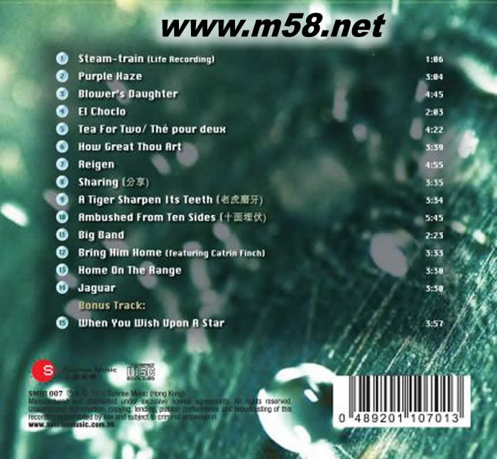 1. Steam-train (Life recording) 2.Purple Haze 3.Blower’s Daugther 4.El Choco 5.Tea For Two 6.How Great Thou Art 7.Reigen 8.Sharing (分享) 9.A Tiger Sharpen Its Teeth (老虎磨牙) 10.Ambushed From Ten Sides (十面埋伏) 11.Big Band 12.Bring Him Home 13.Home On the Range 14.Jaguar Bonus Track: 15.When You Wish Upon A Star