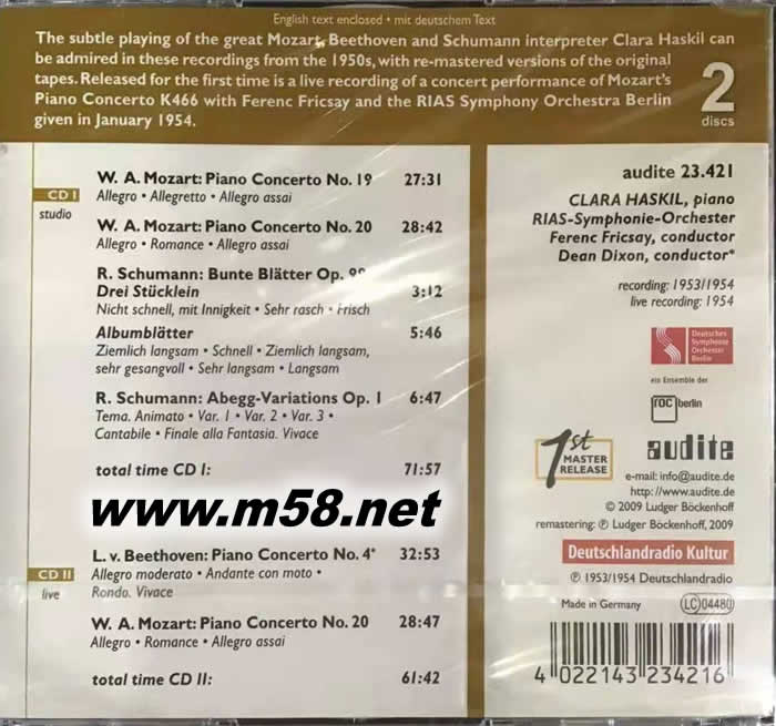 莫札特: 第19 & 20 號鋼琴協奏曲/ 貝多芬: 第4號鋼琴協奏曲/ 舒曼: 變奏曲(m58.net) Clara Haskil 哈絲姬兒 鋼琴/Ferenc Fricsay 弗利柴 / Dean Dixon 指揮 柏林德意志交響樂團 1953/1954年音樂會名演 本專輯由每秒76公分轉速母盤帶重製而成,音質溫厚鬆軟,細節豐富; 德國原裝進口